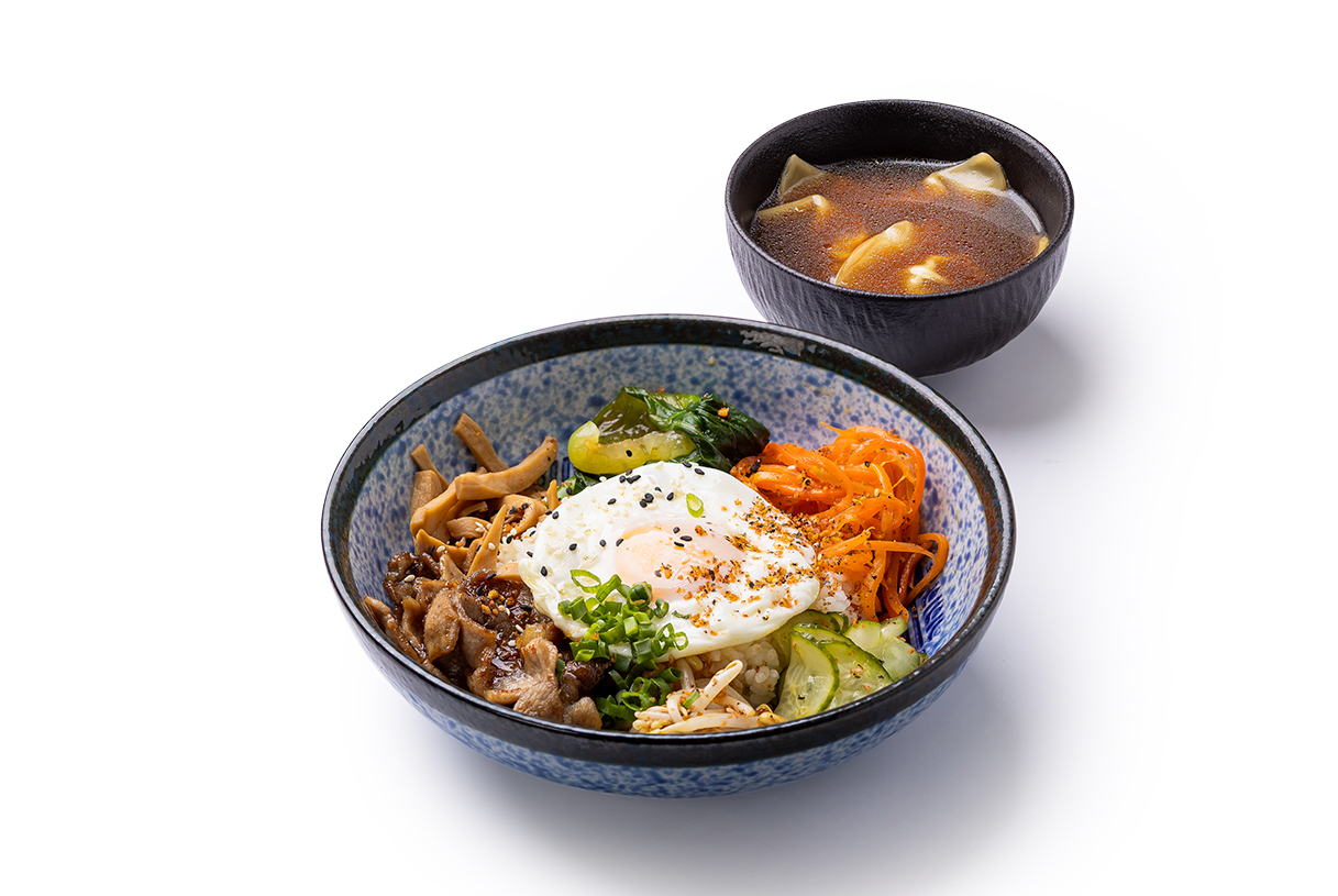 Пибимпаб с говядиной и овощами, подаётся с говяжьим бульоном и китайскими пельменями.
