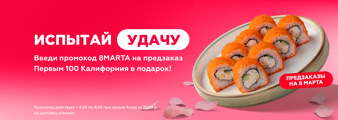 Первые 100 счастливчиков, сделавшие предзаказ от 3500 рублей получат ролл "Калифорния" в подарок по промокоду 8MARTA.