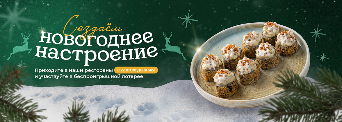 Условия акции: Каждый стол (только один человек со стола, а не каждый гость) в период с 22.12 по 28.12 может попытать удачу и выиграть подарок в зале ресторана при сумме чека от 3000 рублей, который можно использовать сразу.